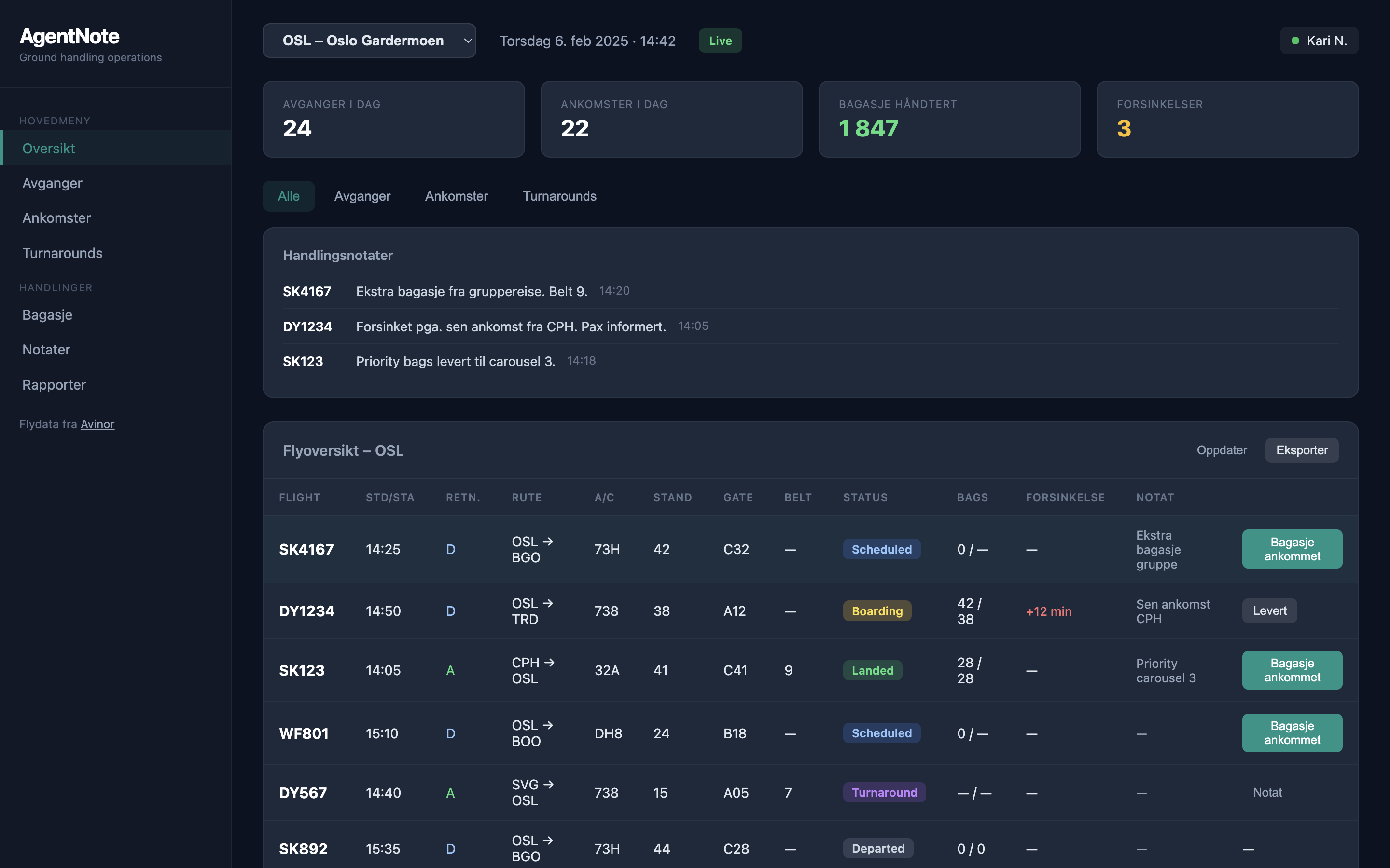 Flyoversikt, bagasjesporing og handlingsnotater for ground handling og daglig drift på ramp.